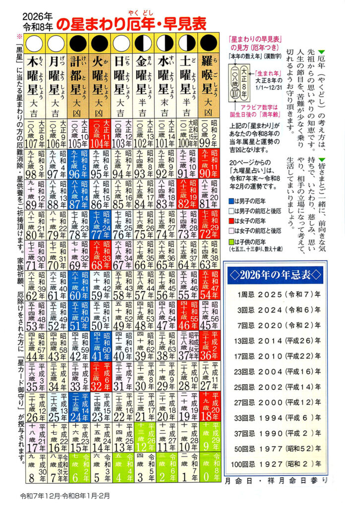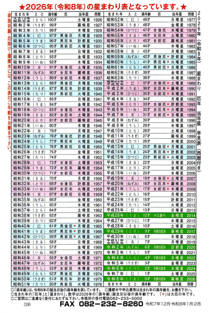 最新情報 観音院について 法主さま 住職さま 丁重な法要(参拝自由)と格式のある葬儀 観音院施設のご案内 山門 寺務所(受付) 本堂 総務 応接室(おうせつしつ) 制作室 納骨仏壇・内持佛(のうこつぶつだん・ないじぶつ) 大日堂 別殿 よくある質問 僧侶養成講座について 僧侶養成講座の掲示板 僧侶養成講座よくある質問(掲示板) 僧侶養成講座 Q&A(よくある質問) 寺院規則 メールで参拝・御喜捨 メールで参拝 御喜捨 萬倍さまのお参り おみくじ ネット霊園 観音院までのアクセス お問い合わせ お問い合わせ観音院(かんのんいん)電話:082-233-5000電話:082-232-8251FAX:082-232-8260所在地:〒733-0032広島市西区東観音町10−2(Google MAP) → お問い合わせ 星まわり厄年・早見表 宿曜経 九曜星(きゅうようせい)占い 九曜各星の運勢 羅喉星(らごうせい) この星は最も厳しい黒星にして悪星なり。運気強きところもあれど、吉凶交錯し、見込み違いが多く、移転、開業、拡張等は時期早尚にして目先欲に心を惑わすならば大損失となり破綻する。災難失敗多き年にて、自制し慎重に過ごすべし 。 土曜星(どようせい) この星は半吉なり。 黒星明けの吉年にして、運気不安定なり。夏秋に病気にかかりやすく、家族の意見を尊重し、不注意による交通事故や詐欺などに注意する。諸事慎重に計画準備して、次年の発展飛躍に備えるべし。 水曜星(すいようせい) この星は末吉なり。心善き人は善運の好機にあり。目上の方や知人に引き立てられて幸いあり。金運多少好調なれども、慢心すれば凶運となる。家内、親族に啓治多く出費増える。春夏は謙虚にするならば、秋冬にさらに善き兆し、吉運あり。 金曜星(きんようせい) この星は半吉なり。 万事快調に向かうも慢心すればたちまち破綻を招く。 常に世間の恩を思い、暖かき心持ちて、相手の立場になって行動するならば、諸事、安定しつつ、飛躍、成功の礎を築く吉年となる。 日曜星(にちようせい) この星は大吉なり。 思うがままに、何ごとにも利あり。順風に帆を上げて走る船の如し。されど、親しき人を失い、秘事表面化して、心労多きことあり。 運気盛んなれども独断を戒めるべし。 火曜星(かようせい) 当星は大凶なり。 感情的争い、火難、盗難、手形事故、交通事故、保証かつぎなどに最大の注意が要る。病は大病の恐れあり。身の周りの問題多く、慎みて年の変わるのを待つべし。 計都星(けいとせい) この星は大悪星なり。 早合点や軽率な行動は思わぬ失敗を招く。 春3月4月は注意を要す。 就職、開業等は良き運もあり、買物吉。ただし資金借入は大凶。万事慎重に過ごすべし。 月曜星(げつようせい) この星は大吉なり。 心暖かき人は龍の水を得たるが如く盛運にして、喜び三重の年なり。 勤勉者は更に大吉祥。全ての物事をなすには、良き相談者を求め熟慮すべし。 吉凶交錯することあり。 木曜星(もくようせい) この星は大吉なり。 春に会いて木の芽を出すが如く何事を始めても良し。 但し、善意でしたことが誤解されて恨まれることあり。目先の小利に走って賭事、投機なすべからず。来年は黒星にて健康に要注意。 今月の運勢 毎月の運勢は、皆さまのお心当たりや善き反省が基となるもので、生活の参考にして頂いています。ご支援ありがとうございます。 羅睺星 土曜星 水曜星 金曜星 日曜星 火曜星 計都星 月曜星 木曜星 最新情報 観音院について 法主さま 住職さま 丁重な法要(参拝自由)と格式のある葬儀 観音院施設のご案内 山門 寺務所(受付) 本堂 総務 応接室(おうせつしつ) 制作室 納骨仏壇・内持佛(のうこつぶつだん・ないじぶつ) 大日堂 別殿 よくある質問 僧侶養成講座について 僧侶養成講座の掲示板 僧侶養成講座よくある質問(掲示板) 僧侶養成講座 Q&A(よくある質問) 寺院規則 メールで参拝・御喜捨 メールで参拝 御喜捨 萬倍さまのお参り おみくじ ネット霊園 観音院までのアクセス お問い合わせ 最新情報 観音院について 法主さま 住職さま 丁重な法要(参拝自由)と格式のある葬儀 観音院施設のご案内 山門 寺務所(受付) 本堂 総務 応接室(おうせつしつ) 制作室 納骨仏壇・内持佛(のうこつぶつだん・ないじぶつ) 大日堂 別殿 よくある質問 僧侶養成講座について 僧侶養成講座の掲示板 僧侶養成講座よくある質問(掲示板) 僧侶養成講座 Q&A(よくある質問) 寺院規則 メールで参拝・御喜捨 メールで参拝 御喜捨 萬倍さまのお参り おみくじ ネット霊園 観音院までのアクセス お問い合わせ お問い合わせ観音院(かんのんいん)電話:082-233-5000電話:082-232-8251FAX:082-232-8260所在地:〒733-0032広島市西区東観音町10-2(Google MAP)